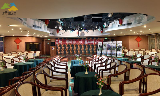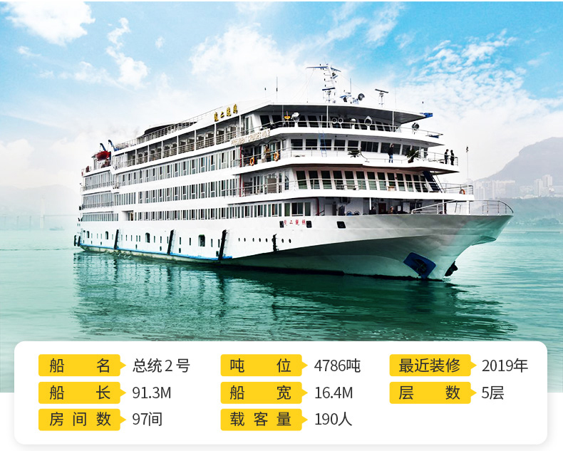 总统二号游轮由美国TEAM7公司设计的内部装修。格调高雅,简洁明亮。大堂宽敞明亮,可与陆地高级酒店媲美。也是长江上客区和娱乐区严格分隔的游船,充分体现了舒适、温馨。采用具有国际先进水平的主机、发动机及空调系统,稳定性能好,噪音低,安全舒适。装备有卫星通讯系统、卫星电视接收系统、闭路电视和立体声系统。船上还设有全方位观景台和阳光甲板,可使游客直接感受到长江及长江三峡的雄、奇、险、幽。