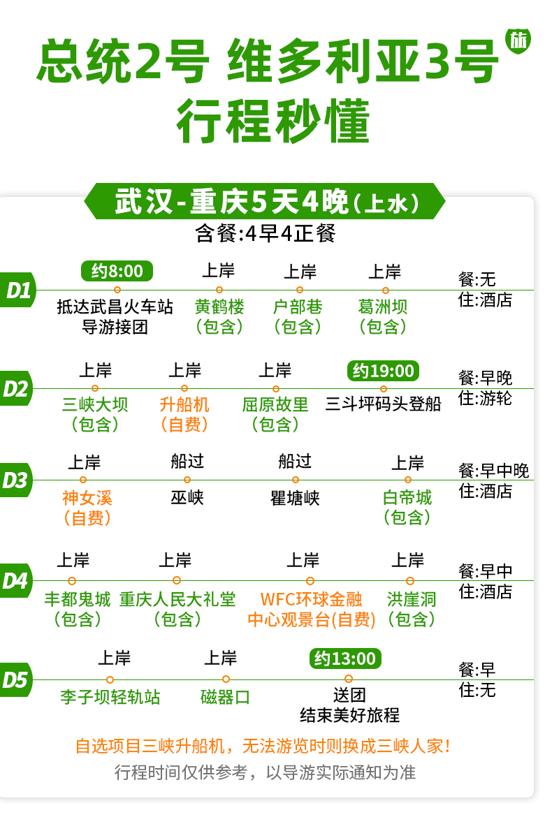 5、游轮行程中所列时间、游览景点、上下船码头及抵离时间仅供参考,游轮将根据实际情况做出合理调整,最终以执行该航次的游船具体安排为准;