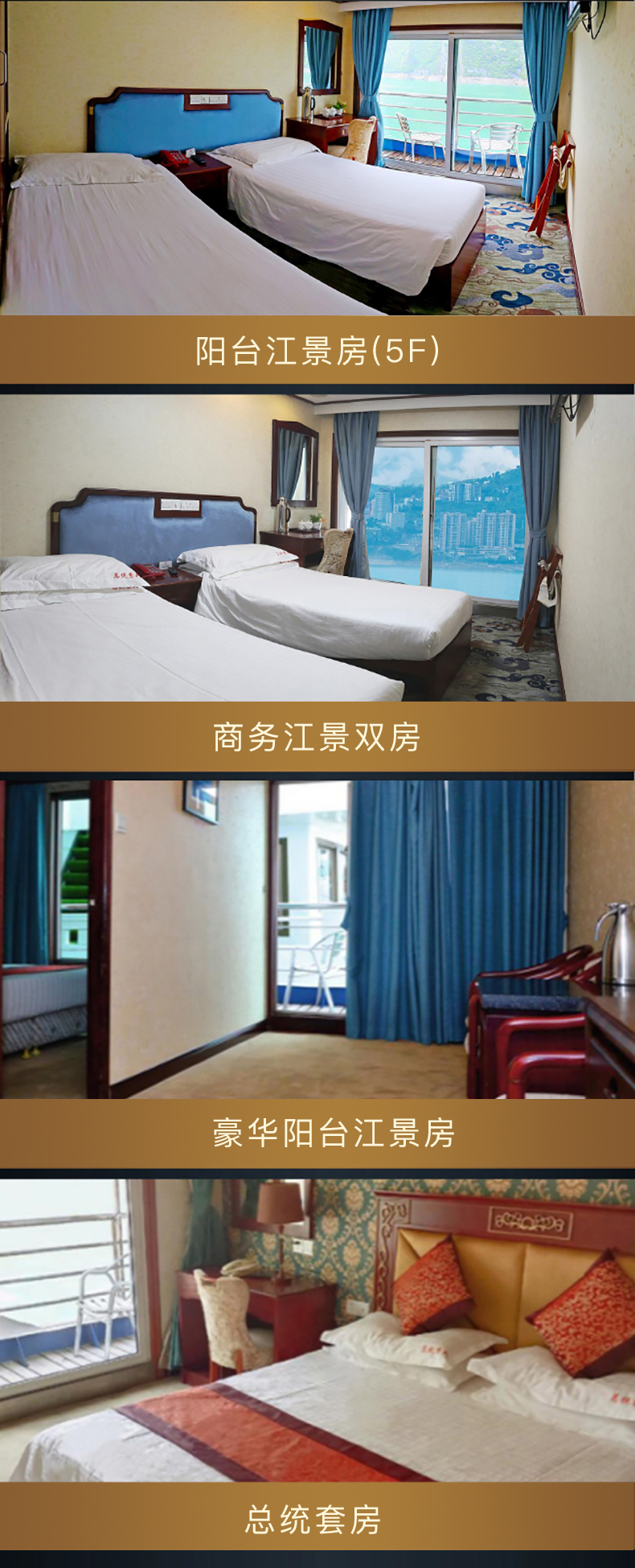 【住宿】 涉外星级游船:二楼为基础楼层,如指定楼层则每上升一层楼需另收费,具体收费详询客服,如无指定则随机划分房间);宜昌或秭归、奉节、重庆入住商务型酒店双标间,确保每人每晚一床位。