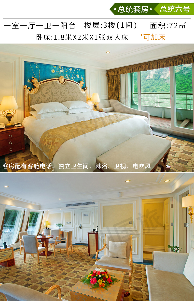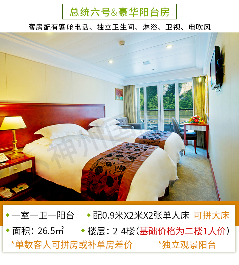 【数量】豪华阳台间可按人数购买,单数客人与同性游客拼房,这是三峡游轮的惯例;